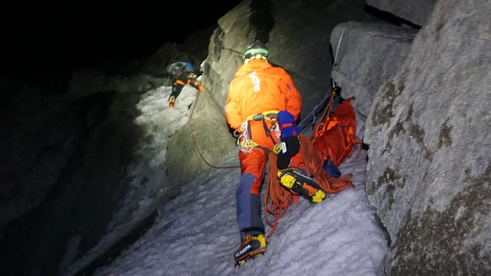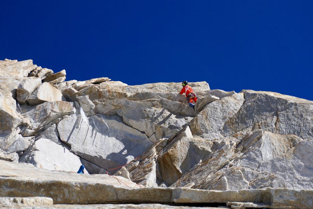 Über eine mühsame zu bewältigende Rinne, die aus bloßem Schotter war, erreichten wir den Gletscher. Auf 5000 Meter beschlossen wir, unser erstes Biwak auf einen schönem markanten Felsgrad auf zu stellen. Eine sternenklare Nacht machte die ganze Atmosphäre noch spezieller. Um 2:00 Uhr war dann das Frühstück und der Café dort runtergeschüttetet, wo er hingehört und wir stapften jeder für sich im Lichtkegel seiner Stirnlampe zum Wandfuß der Eisflanke. Als das Gelände schwieriger wurde seilten wir uns an und wir kamen gut weiter. Ein traumhafter Sonnenaufgang begrüßte uns, als wir auf einem Schneeplateu Pause machten.Wir entschlossen uns, von der Westseite des Berges auf die Süd-Ost Kante zu wechseln. Wir erhofften mittels der Traverse eine größere Chance den Gipfel zu erreichen. Unser Plan ging auf. Auf kompakten Granit, der sich darüberhinaus noch perfekt zum Klettern eignete, gewannen wir Höhenmeter um Höhenmeter. Um 8.00 Uhr konnten wir uns schließlich überglücklich am höchsten Punkt die Hände reichen. Gmeisnam freuten wir uns über die erst dritte Besteigung des 6050 Meter hohen Panmah Kangri.