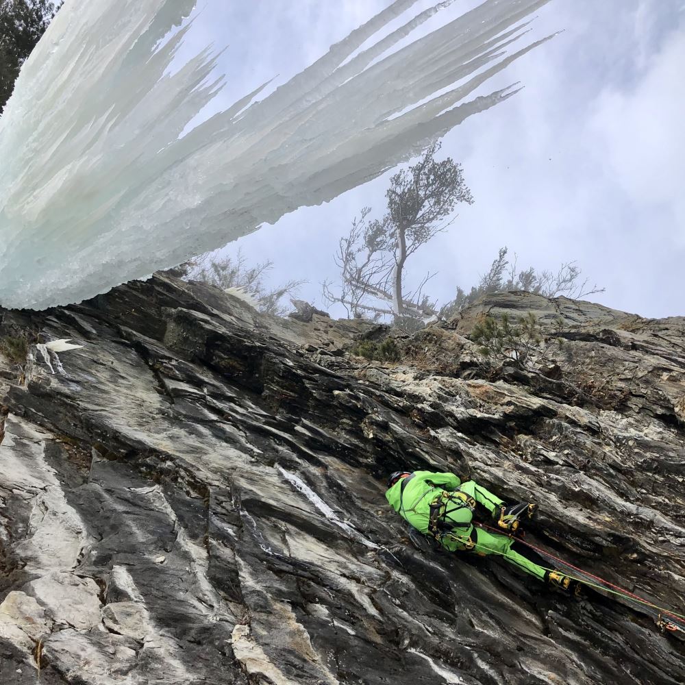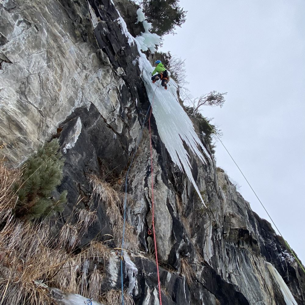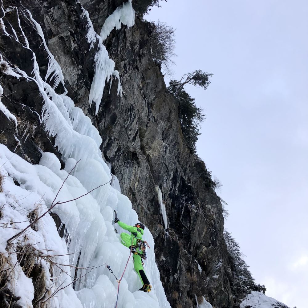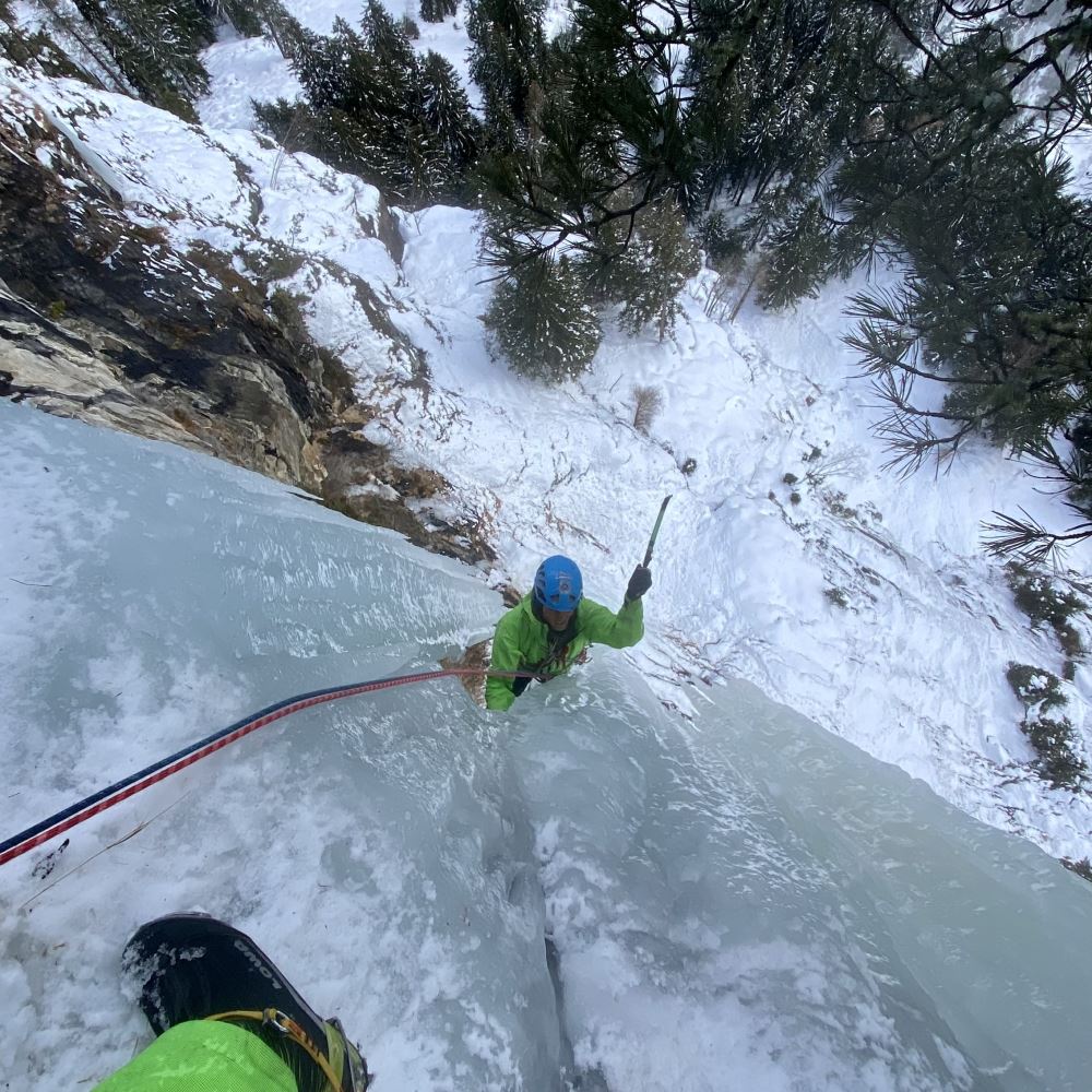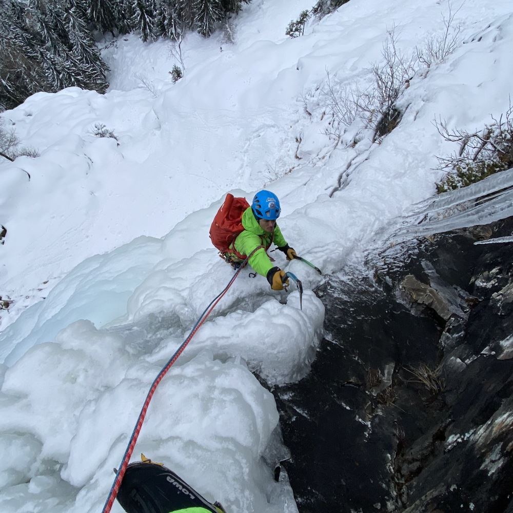 Doch Ende Januar 2021 sollte es nun endlich soweit sein. Der Verlauf des heurigen Winters und die Temperaturen boten optimale Verhältnisse. Der Zapfen hatte die richtigen äußeren Bedingungen, um schlussendlich optimal zu wachsen. Bereits Mitte Dezember wollte ich die Route versuchen. Doch einige klare und sonnige Tage vereitelten dieses Vorhaben. Der steile Zapfen brach ein Erstes Mal ab. Da die Linie südseitig ausgerichtet ist, ist der Ausstiegszapfen um die Mittagszeit erbarmungslos dem Sonnenlicht ausgesetzt. Ich hoffte auf die passenden Wetterprognosen. Diese sollten nun Ende Januar eintreten. Bewölkt, kalt und höchstwahrscheinlich keinen einzigen Sonnenstrahl – für das Vorhaben, die Route erstmals ernsthaft zu probieren ideale Bedingungen. Der Eisvorhang war wieder nachgewachsen und erschien genügend stabil zu ein. Mit meinem Bergführer Kollegen Mark Oberlechner fand ich einen ebenso motivierten Partner. Am Freitag, 29. Januar konnten wir die Neue Route schließlich verwirklichen.