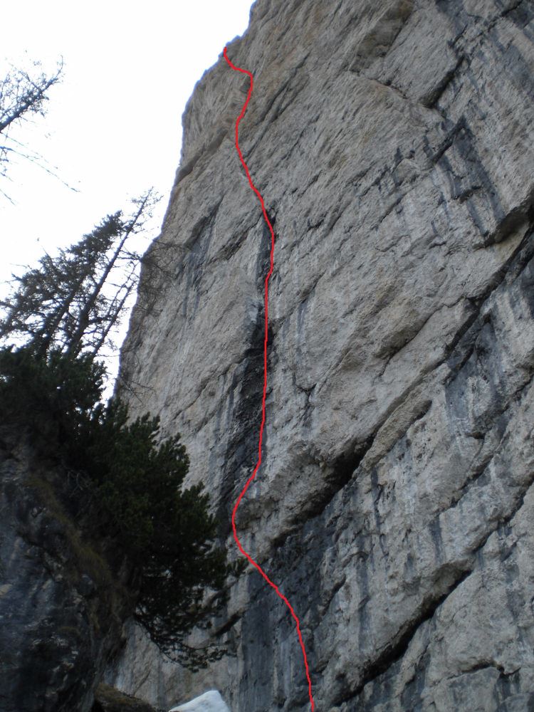 Beschreibung: Die Tour startet im oberen Bereich der Geierwand, direkt über einen schwarzen Wasserstreifen, welcher nach der ersten Seillänge in ein absolut logisches Riss- und Verschneidungssystem übergeht.