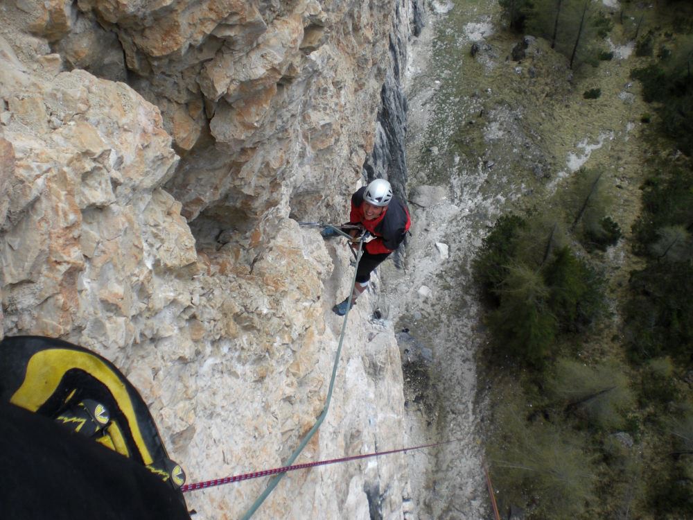 Erstbegehung der Alpinroute mit steiler Wand- und Risskletterei an der Geierwand im Höhlensteintal (Pragser Dolomiten) mit Günther Ausserhofer.